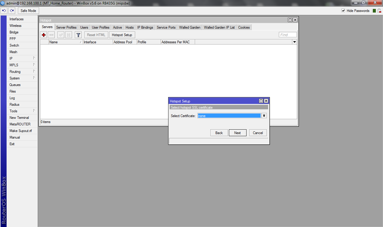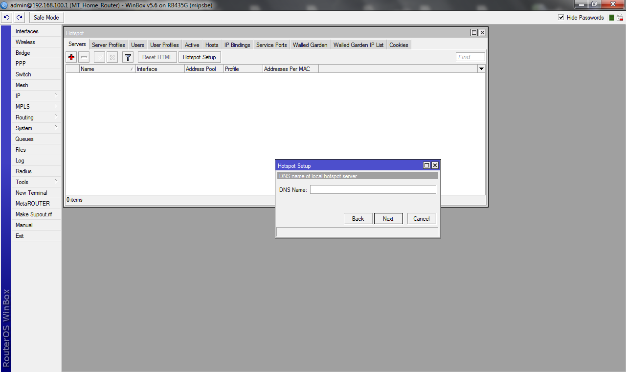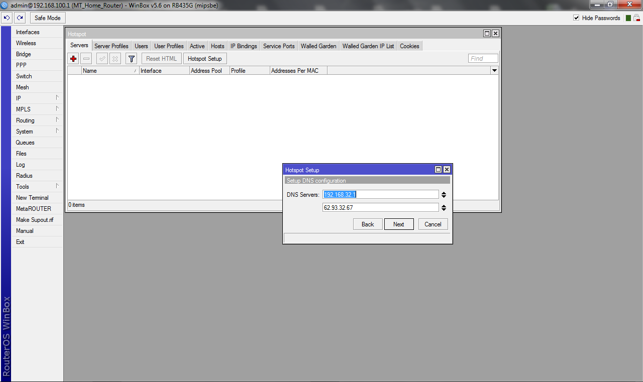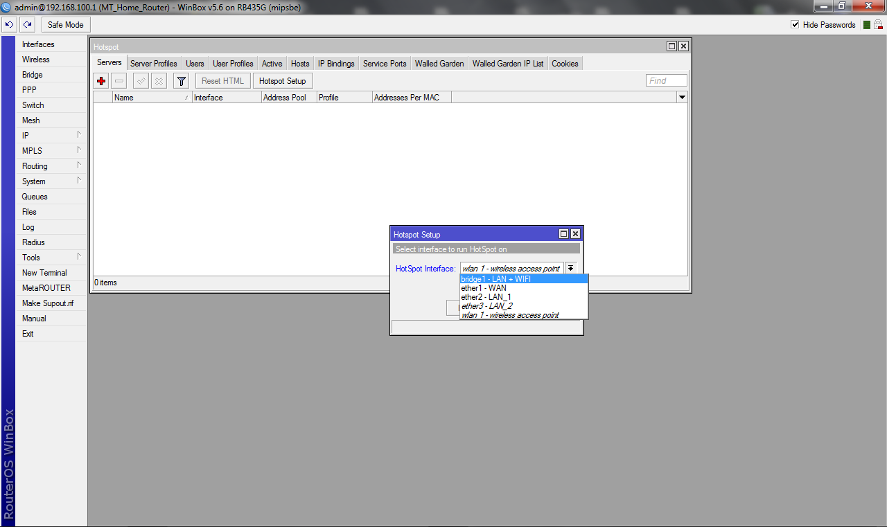 1. Na skonfigurowanym routerze przechodzimy kolejno do IP -> Hotspot -> W zakładce Servers włączamy Hotspot Setup. Jako interfejs głowny wybieramy bridge1.