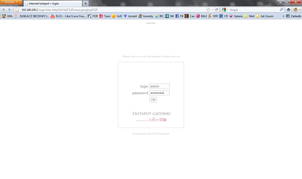 5. Po dodaniu serwera stracimy połączenie z naszym Mikrotikiem. Musimy uruchomić przeglądarkę, po czym ukaże nam się okno logowania do hotspota. Podstawowym kontem jest konto admina, z danymi dostępu jak do konfiguracji.